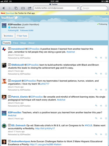Secretary Duncan has a Twitter account! It took a couple of years, but he is tweeting. He is not tweeting with any regularity and he only follows 34 people. This bothers me. He is the Secretary of Education. He is the "leader" of all things education related in this country and he only follows 34 people? My 1 month old follows more people than that. How can he "hear" anyone if he is not listening? Duncan has had an uphill battle since he took over the post. He is not a teacher. That is something that many teachers have a hard time accepting. To overcome this issue, he should be reaching out to educators across the country as much as possible. Twitter, along with other social media tools, allow him to hear from all walks of life. Most people just want to be heard, but the current system employed by the Department of Education is failing to do this. Secretary Duncan needs to find the right places and times to engage educators in meaningful discussion.